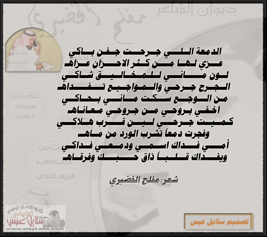 الدمعة اللي جرحت جفن باكي = عزي لها من كثر الاحزان عزاه لون ماني للمخاليق شاكي = الجرح جرحي والمواجيع تفداه من الوجع سكت ماني بحاكي = اخفي بروحي من جروحي معاناه كميت جرحي لين قرب هلاكي= وفجرت دمعاً تشرب الورد من ماها أمي فداك اسمي ودمعي فداكي= وفداك قلباً ذاق حبك وفرقاه